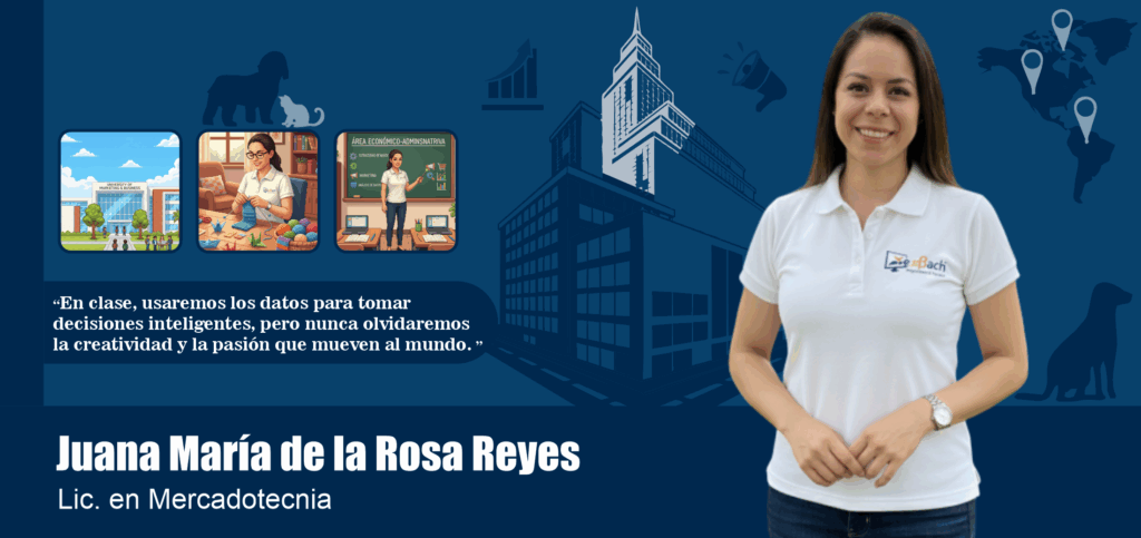 ¡Hola! Soy Juana María de la Rosa Reyes, Licenciada en Mercadotecnia y tu profesora en el área Económico-Administrativa.